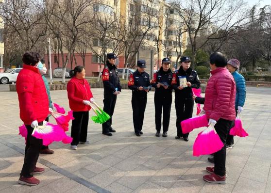奥体中心派出所民警到银座花园社区,面对面向社区群众开展防范养老诈骗及反恐防范宣传。