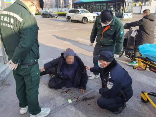 2月25日下午,历下分局东关大街派出所接到指令,在海宴门路口中泰大厦附近有一老人摔倒,请求救助。接到指令,东关大街派出所民警迅速携带警用装备到达现场,发现一名老人坐在地上,地上有血迹。民警查看老人的伤势,并详细了解:老人下台阶时踏空摔倒受伤。民警安抚老人的情绪,并询问老人的姓名和家庭住址,民警一边维护现场的秩序,一边配合帮助120救护人员扶老人到救护车内,将其送往山大二院进行后续治疗。。