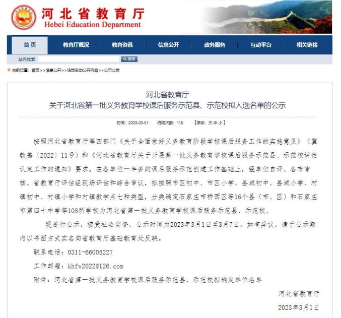 3月1日,河北省教育厅发布关于河北省第一批义务教育学校课后服务示范县、示范校拟入选名单的公示,在各单位一年多的课后服务示范创建工作基础上,经单位自评、各市审核、省教育厅评估组现场评估和综合审议,拟按照市区初中、市区小学、县城初中、县城小学、村镇初中、村镇小学和村镇教学点七种类型,分类确定石家庄市桥西区等16个县(市、区)和石家庄市第四十中学等108所学校为河北省第一批义务教育学校课后服务示范县、示范校。现进行公示,接受社会监督,公示时间为2023年3月1日至3月7日。