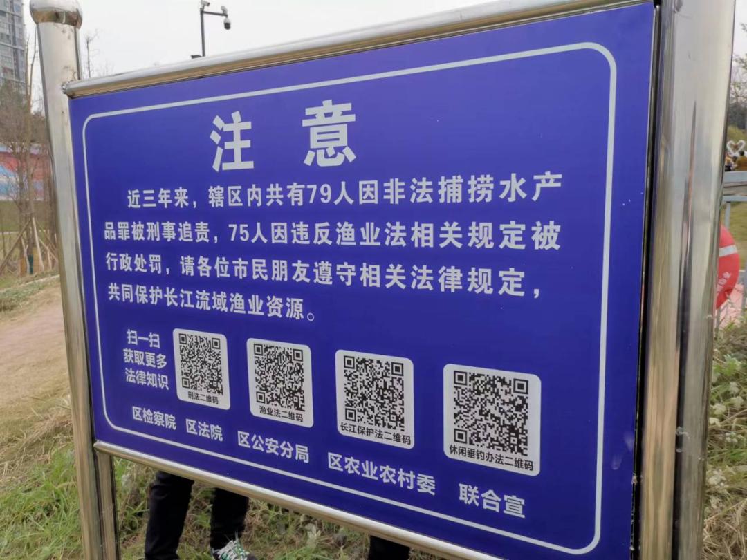 2月27日上午,各单位同志、志愿者们首先来到本次活动的第一站——南滨路大鱼海棠公园。大家首先在江边必经之路旁竖立了精心制作的普法警示标牌,并附上了相关法律法规、渔业知识的二维码,市民朋友们通过手机扫码,即可对上述知识进行学习了解。