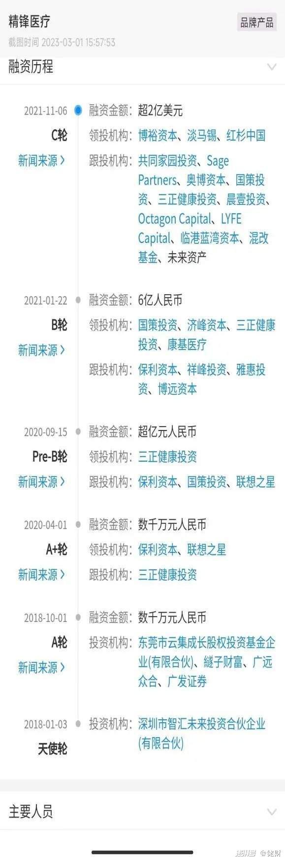 据企查查,2018年以来,精锋医疗融资已至C轮。进驻投资机构包括博裕资本、淡马锡、红杉中国等。截至去年递交聆讯材料,融资金额近20亿元人民币。估值亦水涨船高。据投中网,从创立之初的数千万元暴涨至上市前的15亿美元。