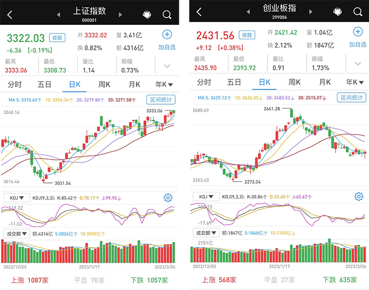 3月6日,两市成交9509亿元,较前一交易日的8695亿元增加814亿元。其中,沪市成交4316亿元,比上一交易日3889亿元增加427亿元,深市成交5193亿元。