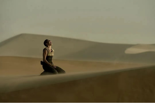 电影中,费洛莎(Furiosa)带领一群女性逃离了一个非常恐怖的社会,在沙漠中一路奔驰,想要前往传说中的绿洲。但她到那个地方的时候就发现,这个绿洲早就干涸了,眼前依然是沙漠,没有地方可以去。她一个人跪在地上,然后又失望又愤怒地发出一声长啸。之后,她收拾好心情,想好策略,重新带姑娘们上路。
