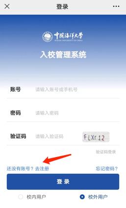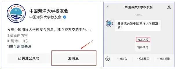 关注“中国海洋大学校友会”微信公众号,点击“发消息”,在下方任务栏,点击“校友入校”,跳转至“中国海洋大学入校管理系统”。