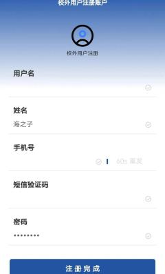 登录“中国海洋大学入校管理系统”,选择“校外用户”,点击“去注册”。进入“校外用户注册账户”界面,填写相关信息,填写完毕后点击“注册完成”。(注:用户名可填写真实姓名或昵称,姓名请填写真实姓名)