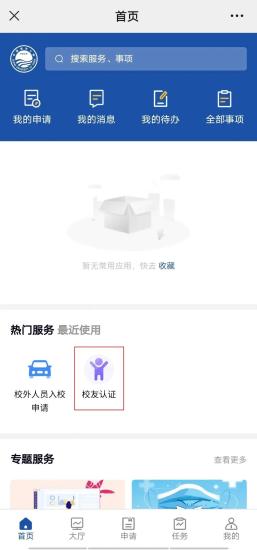 注册完成后,用已注册的账号、密码登录入校系统,进入办事大厅,点击“校友认证”,选择“立即申请”。