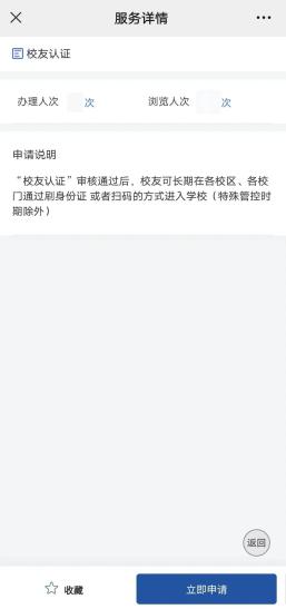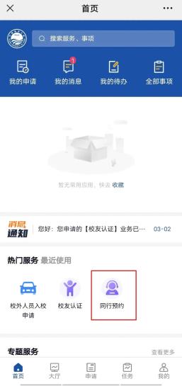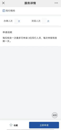 在“办事大厅”,点击“同行预约”(此功能只有在认证校友身份后出现),选择“立即申请”。每位校友一次最多可申请3位同行人员。