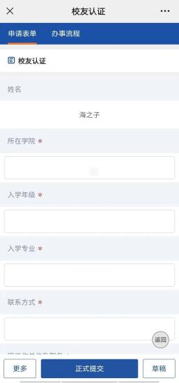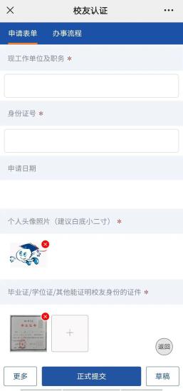 在“校友认证”界面填写个人信息,并上传相关照片,提交审核。