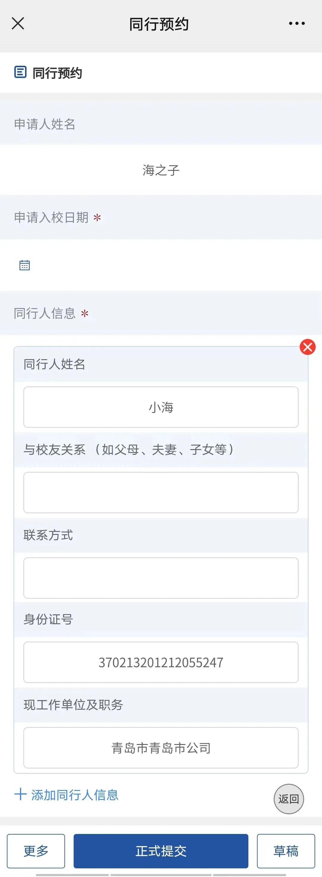 亲属与校友同行入校,可由校友本人登录“中国海洋大学入校管理系统”,通过“同行预约”功能进行预约。校友每次可申请与至多3名亲属同行入校,同行人员入校权限为1天(特殊管控时期除外)。
