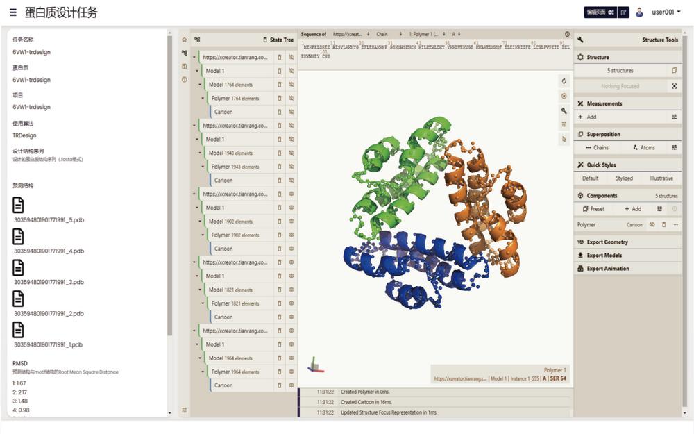 去年10月,具备该功能的xCREATOR工作台正式上线,面向高校师生免费开放;今年2月下旬,团队自主研发的蛋白质扩散模型也正式上线。