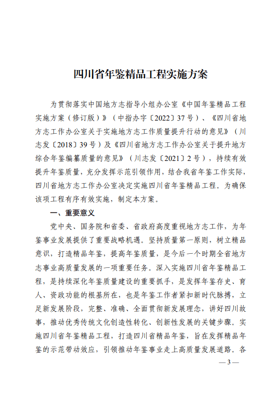为贯彻落实 中国地方志指导小组办公室《中国年鉴精品工程实施方案(修订版)》(中指办字〔2022〕37号) 、 《四川省地方志工作办公室关于实施地方志工作质量提升行动的意见》(川志发〔2018〕39号) 及 《四川省地方志工作办公室关于提升地方综合年鉴编纂质量的意见》(川志发〔2021〕2号) ,持续有效提升年鉴质量,推动年鉴事业高质量发展,经研究决定实施四川省年鉴精品工程。在充分总结经验、广泛征求意见的基础上,省地方志办制定了《四川省年鉴精品工程实施方案》。现印发你们,请认真组织实施。