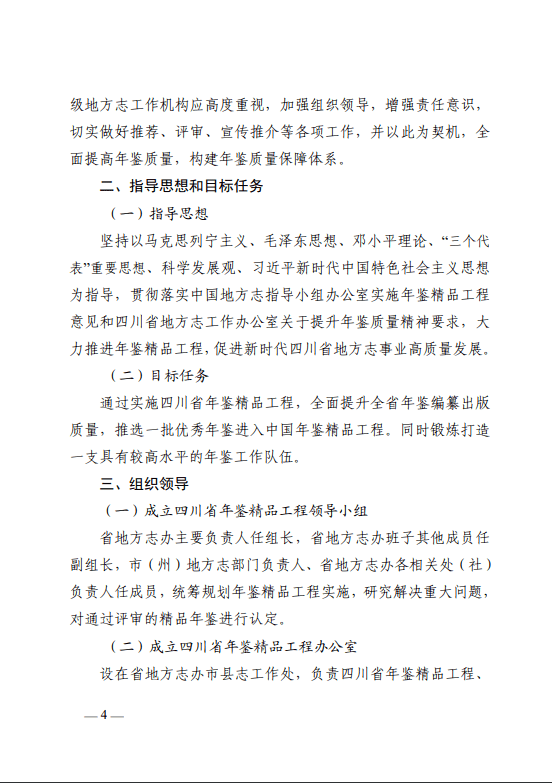 为贯彻落实 中国地方志指导小组办公室《中国年鉴精品工程实施方案(修订版)》(中指办字〔2022〕37号) 、 《四川省地方志工作办公室关于实施地方志工作质量提升行动的意见》(川志发〔2018〕39号) 及 《四川省地方志工作办公室关于提升地方综合年鉴编纂质量的意见》(川志发〔2021〕2号) ,持续有效提升年鉴质量,充分发挥示范引领作用,结合我省年鉴工作实际,四川省地方志工作办公室决定实施四川省年鉴精品工程。为确保该项工程有序有效实施,制定本方案。