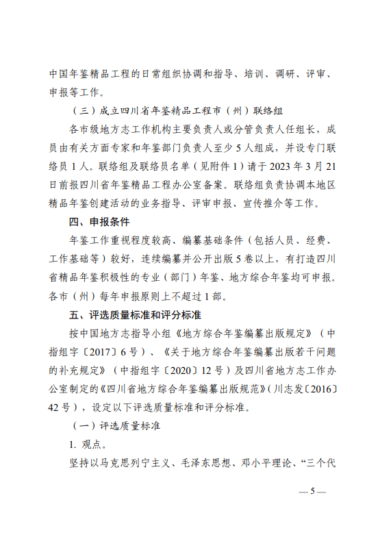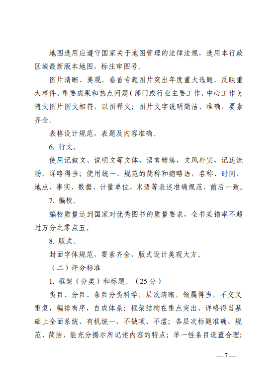 按 中国地方志指导小组《地方综合年鉴编纂出版规定》(中指组字〔2017〕6号) 、 《关于地方综合年鉴编纂出版若干问题的补充规定》(中指组字〔2020〕12号) 及四川省地方志工作办公室制定的《四川省地方综合年鉴编纂出版规范》(川志发〔2016〕42号),设定以下评选质量标准和评分标准。
