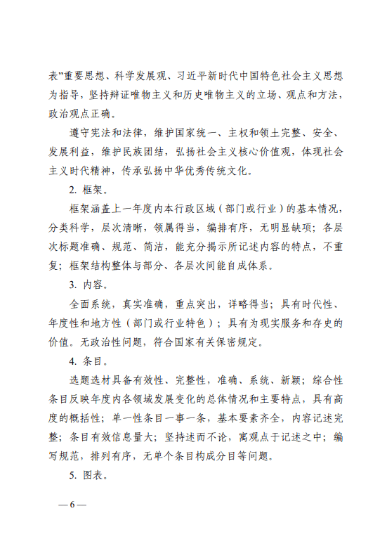 全面系统,真实准确,重点突出,详略得当;具有时代性、年度性和地方性(部门或行业特色);具有为现实服务和存史的价值。无政治性问题,符合国家有关保密规定。