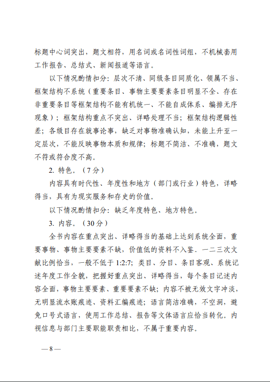 全书内容在重点突出、详略得当的基础上达到系统全面,重要事物、事物主要要素不缺,价值低的资料不入鉴。一二三次文献比例恰当,一般不低于1:2:7;类目、分目、条目客观、系统记述年度工作全貌,把握好重点突出、详略得当,每个条目记述内容全面,事物主要要素、重要要素不缺;内容不被无效文字冲淡,无明显流水账痕迹、资料汇编痕迹;语言简洁准确,不空洞,避免口号式语言,使用工作总结、报告等文体语言应恰当转化。内视信息与部门主要职能职责相比,不属于重要内容。