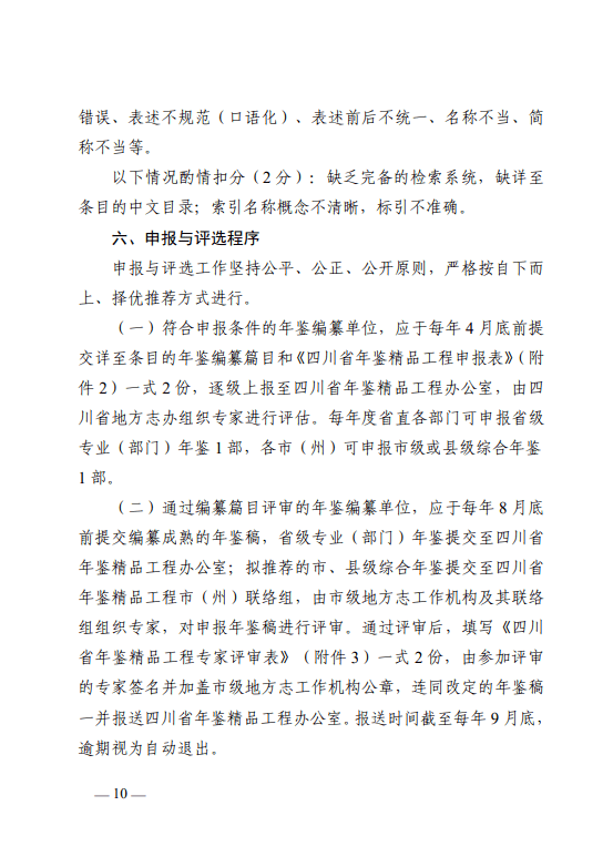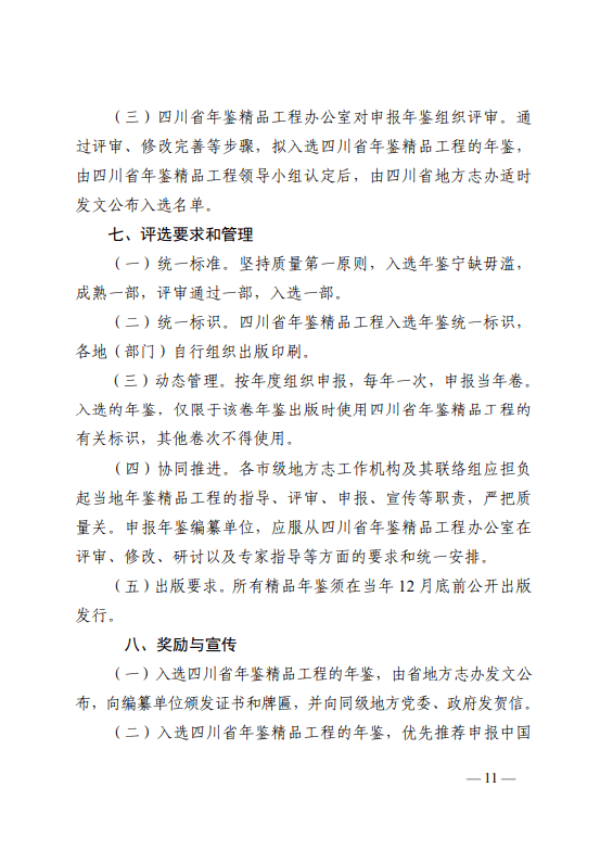 (三)四川省年鉴精品工程办公室对申报年鉴组织评审。通过评审、修改完善等步骤,拟入选四川省年鉴精品工程的年鉴,由四川省年鉴精品工程领导小组认定后,由四川省地方志办适时发文公布入选名单。
