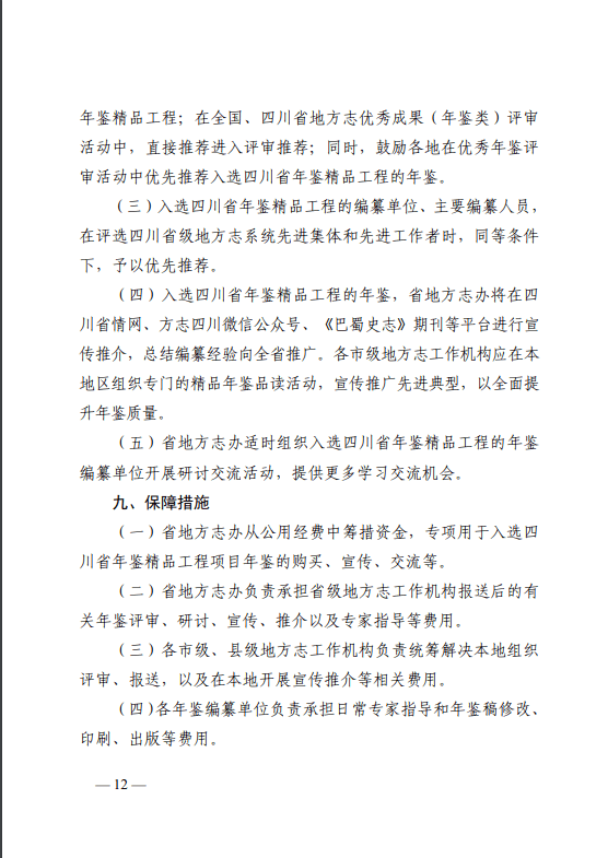(四)入选四川省年鉴精品工程的年鉴,省地方志办将在四川省情网、方志四川微信公众号、《巴蜀史志》期刊等平台进行宣传推介,总结编纂经验向全省推广。各市级地方志工作机构应在本地区组织专门的精品年鉴品读活动,宣传推广先进典型,以全面提升年鉴质量。