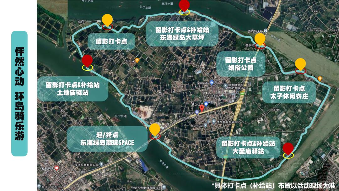 A:在南沙河堤绿道环岛骑行1圈(约13.14公里,蕴含一生一世同心同行的美好寓意哦!)途中设置6个互动打卡点,将均安南沙的三书六礼非遗传统婚俗融入其中,增加骑行趣味;其中3个打卡点还提供补给服务(供应水和面包、提供医疗救助及单车维修服务等);