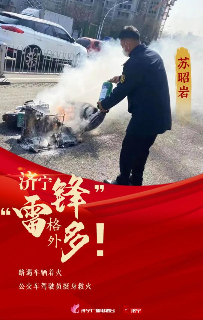 2023年2月25日中午11时23分许,济宁公交集团嘉祥分公司驾驶员苏昭岩驾驶公交车运营时,发现不远处有电动车辆自燃,浓烟滚滚。向乘客说明情况后,苏昭岩打开车门,秒变“救火英雄”,拎起灭火器穿过马路实施扑救。平凡的岗位不平凡的举动,也是许多像苏昭岩一样当代济宁公交驾驶员“向善、向美、向上”的价值追求。