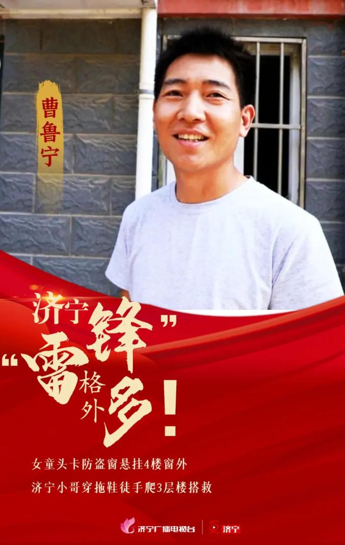 2022年,在济宁明珠新奥苑小区,一名幼童被卡到了4楼防盗窗户的夹缝中,命悬一线,哭声撕心裂肺。正在家中吃饭的曹鲁宁听到后,踩着拖鞋冲了出去,光着膀子爬楼,徒手救下四岁娃。没有任何防护,怀着最赤诚的热心,他完成一次生命的托举。