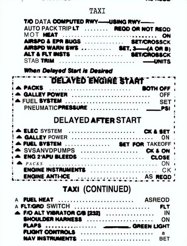 很快DL1141号航班便获得了滑行许可,但需要让位于前面排队的飞机。飞行工程师贾德开始阅读滑行检查单,这是飞机起飞需要完成的任务清单。贾德每读完一项,副驾驶柯克兰需要采取行动,并做出喊话回应。