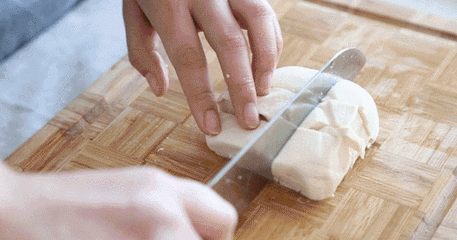 仔细观看豆腐的切口处,优质的豆腐,切口处平整,看起来质地细嫩,结构匀称,有弹性不黏粘;