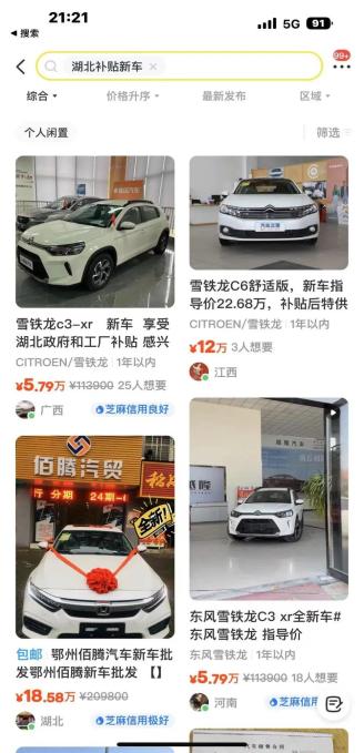 车fans创始人孙少军对笔者表示,整个燃油车的市场价格已经在这一波“踩踏式”降价后失去了控制。普通消费者在看到动辄降低5万乃至9万元的新车价格后,不会去探究其背后的深层产业逻辑。大家的直观感受只会是:“燃油车,就值这个钱。”要知道,尽管按照厂家要求,前面所提到的补贴仅限于湖北省境内的购车和上牌行为,但由于广大车商们的“努力”,这些车源已经蔓延到了全国。在闲鱼上以“湖北补贴新车”为关键词搜索可以看到,全国各地都能以补贴后价格买到新车。
