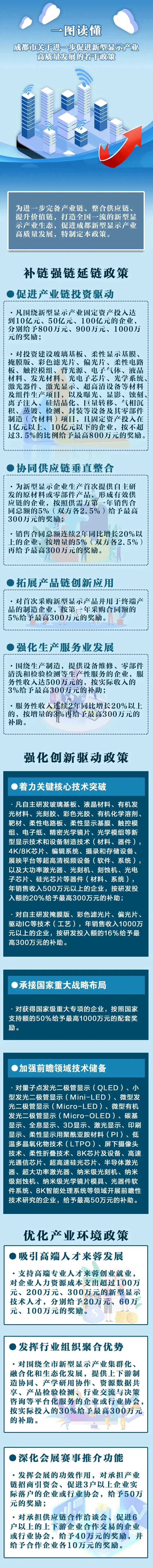 《成都市关于进一步促进新型显示产业高质量发展若干政策的意见》共涵盖5章、14条,约1900字,聚焦进一步延伸产业链、融通供应链、提升价值链,打造涵盖“技术研发—面板制造—终端应用”的新型显示研发生产制造基地和智能产品应用基地,构建全国一流的新型显示产业集群。成都市经信局介绍,据行业反馈,该项政策系全国唯一一个专门以“新型显示”命名的扶持政策。政策显示,将围绕链主链属企业,完备产业链强化供应链,着力补链强链延链,加强生产服务业发展,最高扶持达到1000万元,使产业链不尽完备、供应链配套不佳等问题得到进一步改善。