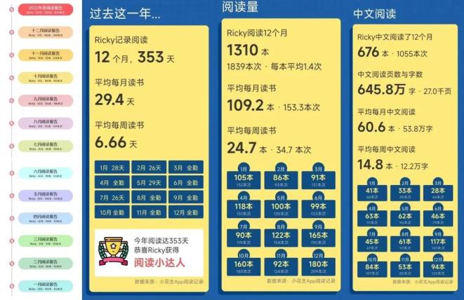 2022年的年度阅读报告出来后,我马上给他看了这一年的阅读记录,看完后我问他有什么感想,他说看到了进步,坚持很酷,后面还要继续坚持阅读。