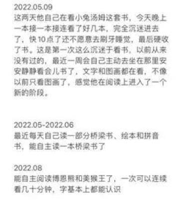 这是他第一次这么沉迷于看书,以前从来没有过的,而且那一周会自己主动去坐在那里安安静静看会儿书,我观察到他文字和图画都在看,不像以前只看图画了。