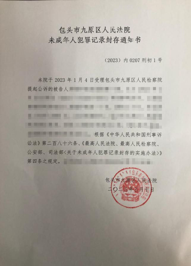 原标题:《【双创双一流】为爱封存,九原区法院发出首份《未成年人犯罪记录封存通知书》》