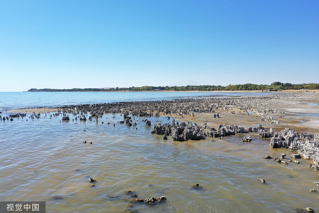 当地时间2022年10月2日,土耳其凡湖,经过数千年形成的微生物岩石笋是一种被称为“水下仙女烟囱”的奇观,由于全球变暖导致的干旱,湖面在降水减少和快速蒸发的影响下不断下降,导致“水下仙女烟囱”裸露在湖岸边。视觉中国 图