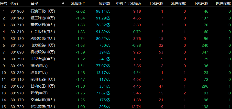 31个申万一级行业中仅有2个板块收涨,其余均收跌,跌幅超过1%的板块约占一半。农林牧渔板块涨近2%,电子板块也逆势飘红。但石油石化、轻工制造、建筑材料、社会服务、纺织服饰、电力设备等板块跌幅靠前,跌约2%。