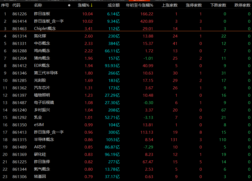 市场还是有亮点的,Chiplet概念、氮化镓、鸡肉概念、猪肉概念、EDR概念等板块成为“绿叶中的红花”。