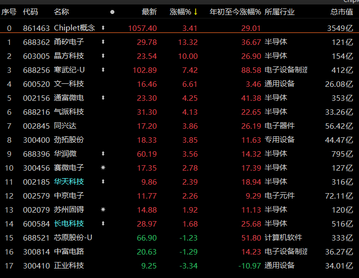 芯片产业链表现不错,Chiplet概念涨逾3%,甬矽电子大涨超过13%,晶方科技涨停,寒武纪-U、文一科技、通富微电均表现不错。