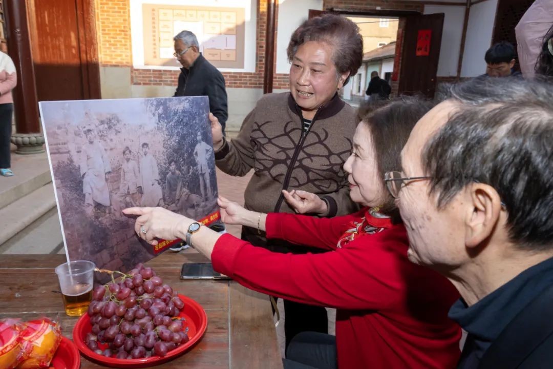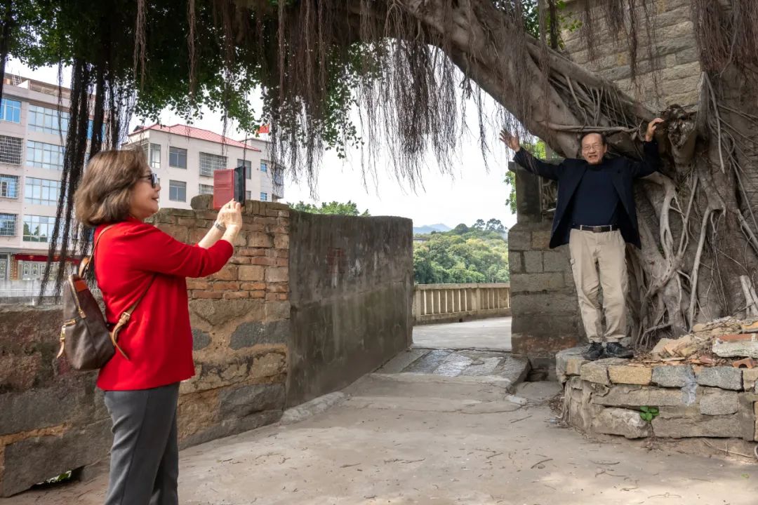 在家乡枫亭霞桥社区,看到一户人家挂着“薛”姓的红灯笼,薛人望和李黎驻足留影湄洲日报社的记者们报道新闻的专业当然不在话下,而追寻考证旧事故址的功力也相当惊人。两年前我来时还不知道公公的老宅,这次已经找到,虽然已建成新楼,但据考证那个地点没错。老宅出来不远处就是一棵百年倒下又挺立起来的古榕树,想象父亲和他的孪生哥哥,亲密无间的兄弟俩,是否攀爬过这棵大树呢?站在树下,人望忽然像个孩子,想要攀爬那棵见证了百年沧桑的大榕树。