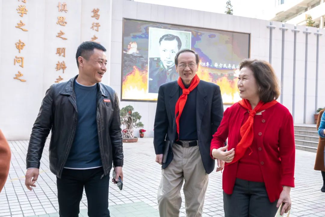 薛人望李黎夫妇来到姚明珠烈士曾执教过的育德小学公公的高中母校,原“涵江中学”,现在是莆田第六中学,位在风景秀丽的青璜山上;校门还保留了原先质朴古雅的红砖门楼。薛介民和孪生哥哥薛仁民在1928年入学初中部,在这里两位少年接触到进步思想,加入“青年反帝大同盟”,参加小组会。1931年他俩考进涵江中学高中部,更是积极投身抗日救国的学生运动:演戏、游行、组织动员同学上街宣传,结果被校方开除,竟然导致同学罢课声援,甚至校长下台、学校停课。这所有着深厚的文化和革命历史背景的学校,师资和学生都非常优秀。我整理公公早年笔记时就发现他的英文程度很好,后来他被派到美国接受新型战机飞行训练时,出色的英语能力让美国教官要求他留下来工作;原来他的英文便是在这所中学打下基础的!这所创办于1924年的省内名校,明年便是建校百年了,我怀着敬佩的心情写下“百年树人”题字。