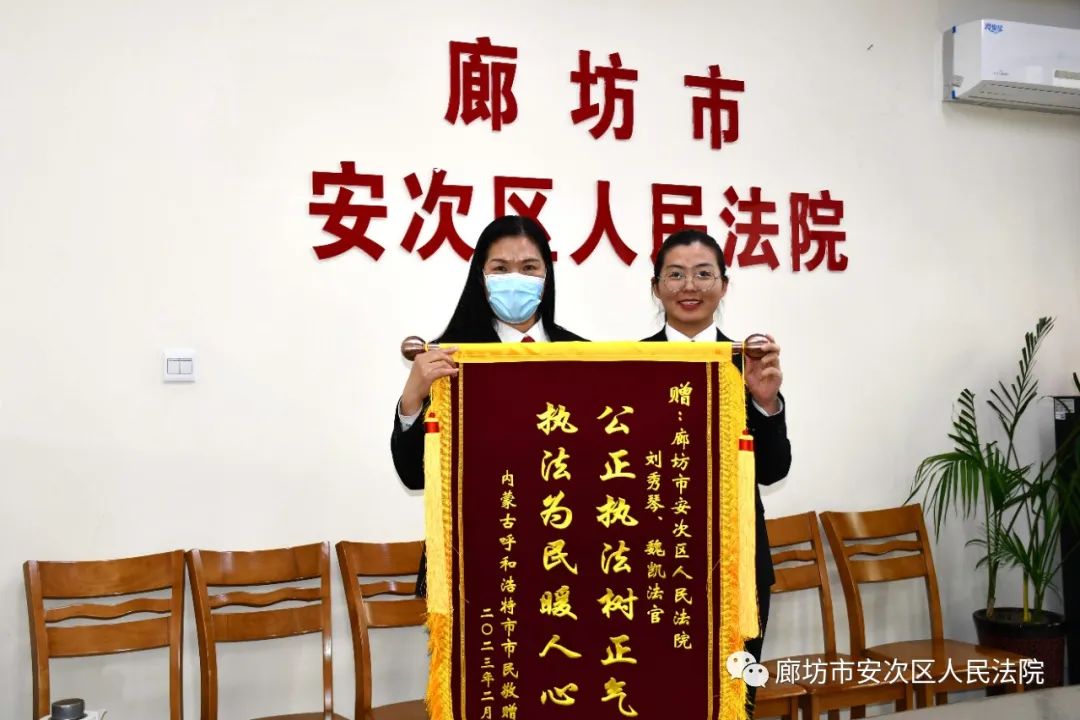 近日,安次区法院调解速裁团队法官刘秀琴、法官助理魏凯收到锦旗和感谢信,对二人通过网络平台耐心帮助调解纠纷,依法维护群众合法权益表示感谢。