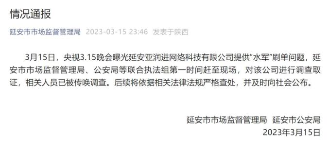 延安市市场监督管理局、延安市公安局15日晚发布情况通报,对亚润进网络科技有限公司提供“水军”刷单问题,延安市市场监督管理局、公安局等联合执法组第一时间赶至现场,对该公司进行调查取证,相关人员已被传唤调查。06