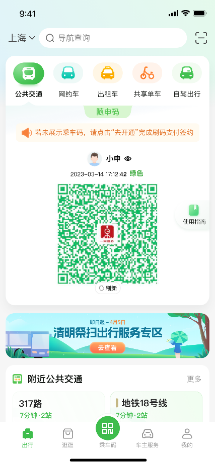 “随申行”是由上海市政府指导,市国资委、市交通委支持下推出的交通行业生活数字化转型“出行即服务” (MaaS)品牌。目前,APP的出行服务功能已涵盖公共交通、网约车、出租车、共享单车、智能停车等多程一站式出行服务,特色“一码通行”覆盖了公交、轨交、轮渡等市内公共交通。在清明祭扫、踏青出游等出行高峰,“随申行”建议有祭扫出行计划的市民,尽可能选择“公共交通+踏青扫墓专线”的绿色出行方式。