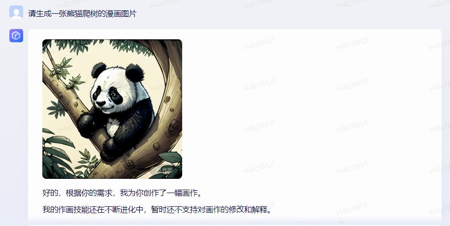 刺猬公社也进行了类似的尝试,在“生成一张熊猫爬树的漫画图片”的指令下,文心一言给出了一张质量较高的画作,画面上的熊猫憨态可掬。