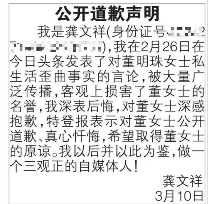 我是龚文祥,我在2月26日在今日头条发表了对董明珠女士私生活歪曲事实的言论,被大量广泛传播,客观上损害了董女士的名誉,我深表后悔,对董女士深感抱歉,特登报表示对董女士公开道歉、真心忏悔,希望取得董女士的原谅。我以后并以此为鉴,做一个三观正的自媒体人!