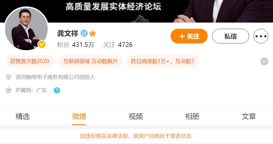 公开信息显示,龚文祥为深圳触电电子商务有限公司创始人,微博粉丝431.5万,不过其微博主页显示:因违反相关法律法规,该用户目前处于禁言状态。