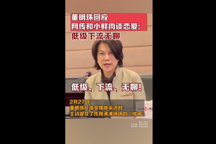 据中国经济周刊,2月27日,董明珠在接受媒体采访时主动提及了这段传得沸沸扬扬的“绯闻”:“可能你们也都看了,没说而已,什么小鲜肉……”董明珠说,(完全是)捏造出来的,没有任何依据的东西,就为了博人眼球,为了赚那么一点钱。“我不知道这些人的良心是什么,如果他是一个年轻人,我不知道这个年轻人是怎么对自己的人生定位的。年轻人一定要有正确的三观。”董明珠还直斥:“低级、下流、无聊!用这几个词形容也不为过。”