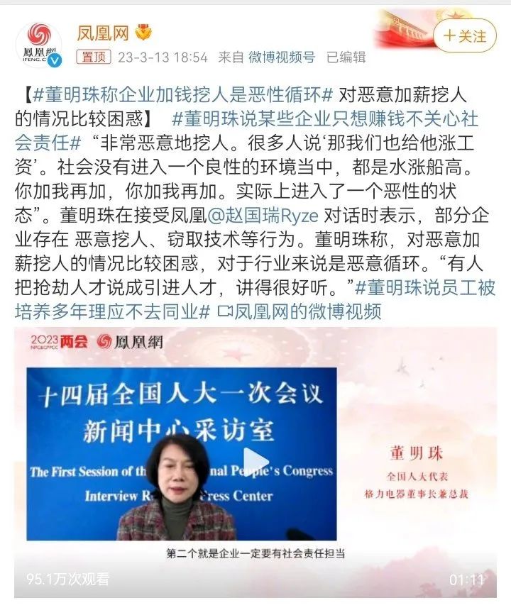 就在今年3月13日董明珠的一段言论成为“热搜”。她在接受媒体采访时指出,对于部分企业存在 “恶意挖人”、窃取技术等行为,“一方面扰乱了企业运行,第二个破坏了创新的环境。有些企业不在这方面进行投入,而用挖人的办法,给环境造成恶性循环。”“有人把抢劫人才说成引进人才,讲得很好听。”