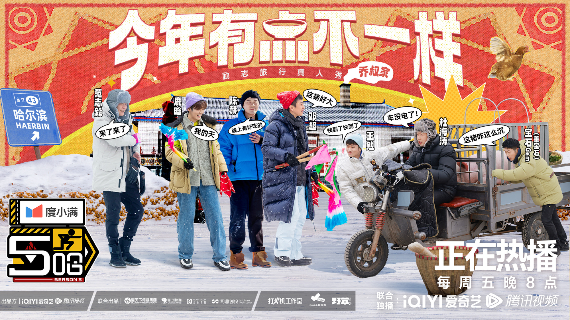 本周播出的节目里,五哈兄弟团置办起了年货。在东北过年得吃杀猪菜,但五哈团送猪之途困难重重,真是想吃口热乎的年夜饭,貌似有点难,也是笑点频出。车上拉着老母猪,车打不着火全靠推……有人感叹:“这谁点的白肉血肠,(走这)一趟赶上取经了!”