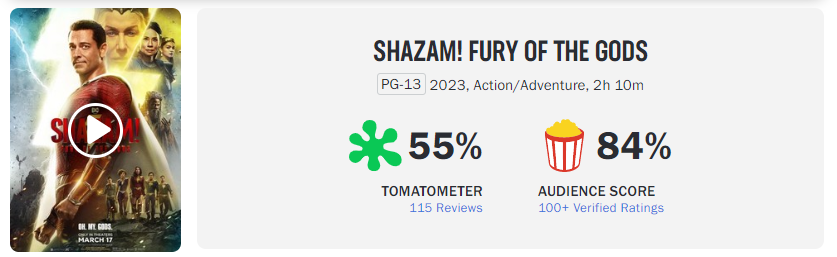 不过,《雷霆沙赞!众神之怒》在烂番茄上遭到差评,影评人仅给出55%的分数,一般观众评分为84%。