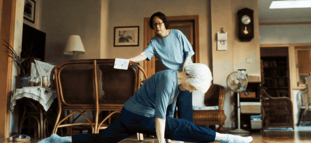 在《妈妈!》里她有一段戏,是在瑜伽垫上做平板支撑,一字马下腰一分钟,丝毫不带喘。许多00后网友看到后感到羞愧——“我连一个老奶奶都不如。”