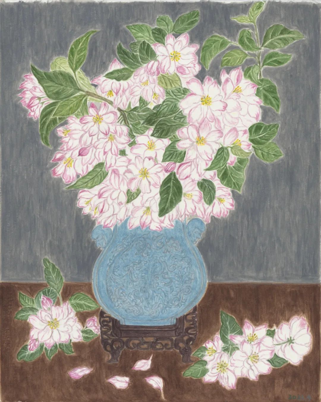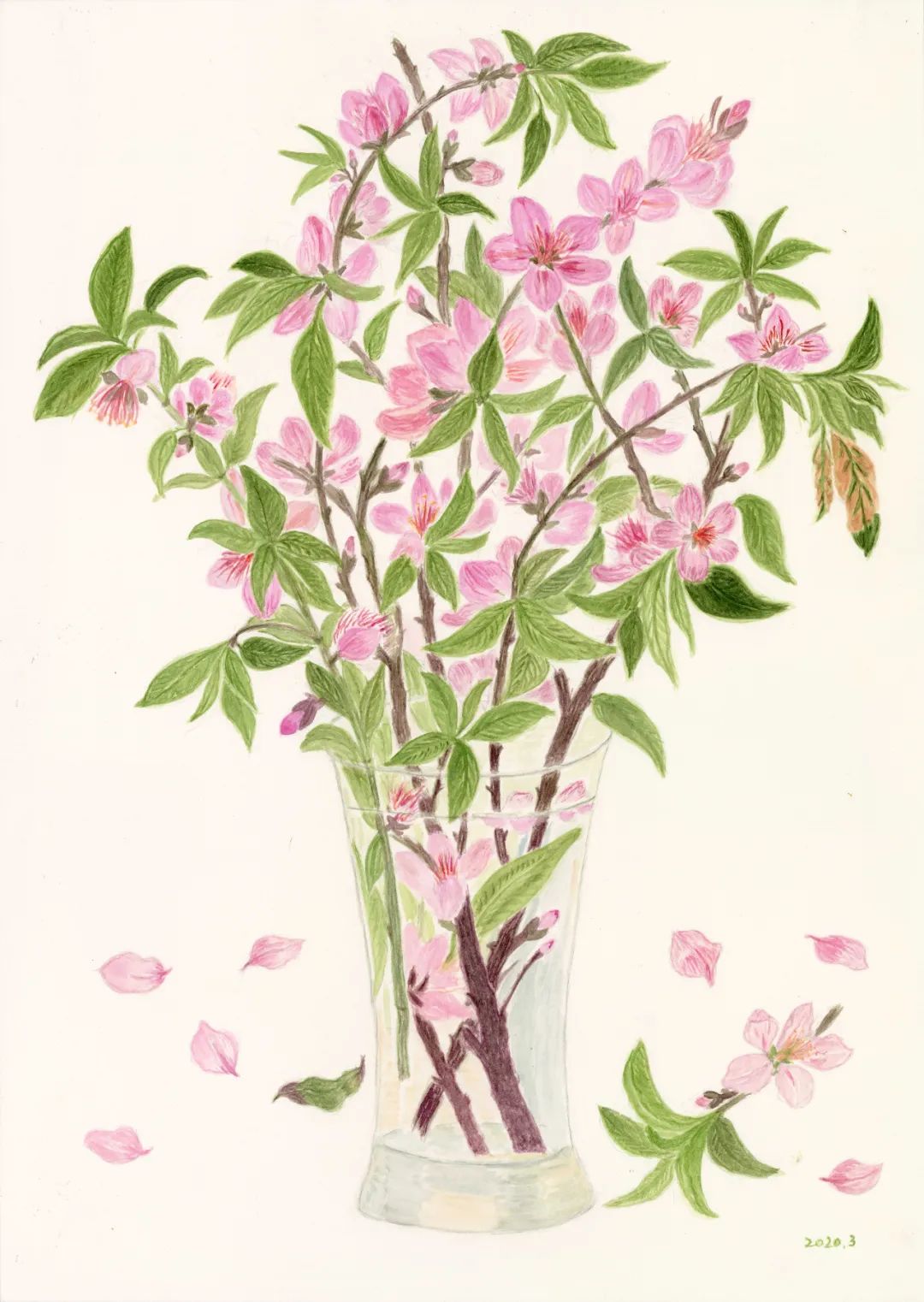 家门口的海棠和桃花开得正好,她随手折几枝来,修剪一下,插进一个合意的花器里。画着画着,感觉真的好像春天来了。