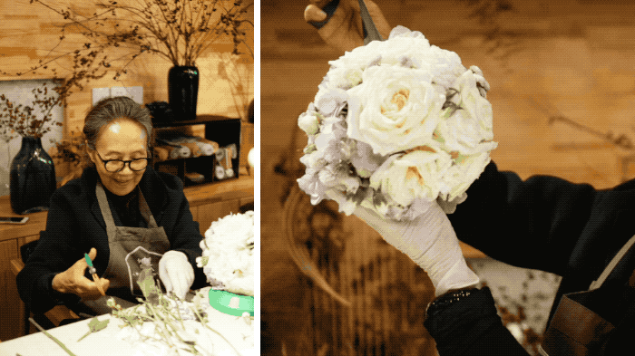 她喜欢学习新知识,在北京报了一个插花的班,竹子、麻绳编织的花器,插花小老师教一款,她就学一款。闲的时候一个月去四次,有时候一年才去一次,但是“一看见那些花,就会很开心。”